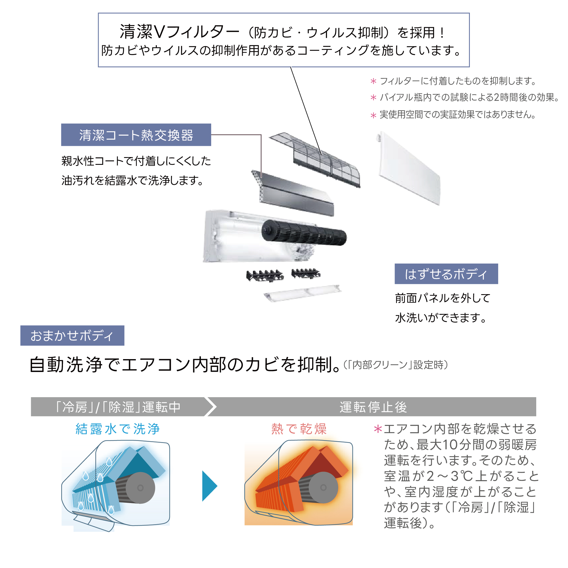 「結露水で洗浄」「熱で乾燥」