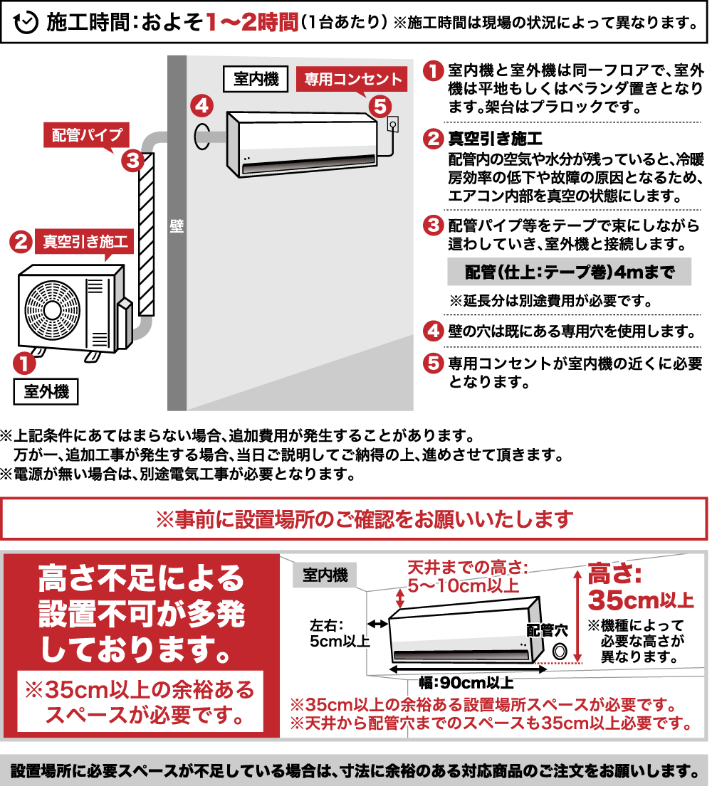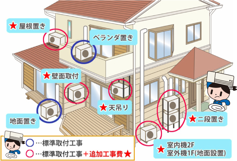 室外機の設置場所や設置状況により、標準取付工事とは別途で室外機設置の追加工事費用がかかります。